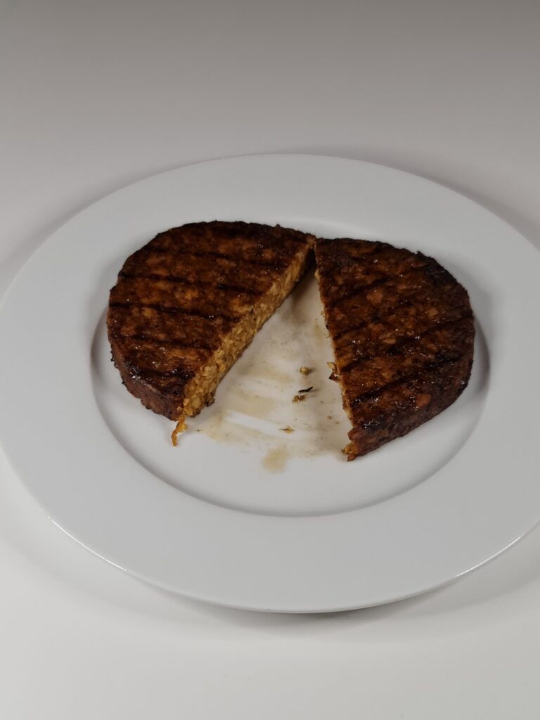 Optisch sind die Burger bereits „vorgegrillt“, wie die Grillstreifen und die braune Farbe zeigen. Die 100g schweren Patties sind eher dünn, dafür bieten sie eine grössere Fläche. Im Innern ist die Struktur eher grob und man sieht verschiedene Zutaten direkt. Geschmacklich ist der Burger ziemlich neutral – er bringt eine leichte Würze mit und eigentlich keinen Eigengeschmack. Dennoch gibt es ein leichtes Umami-Gefühl im Mund. Damit ist er sehr unauffällig, erledigt aber seinen Job solid.
