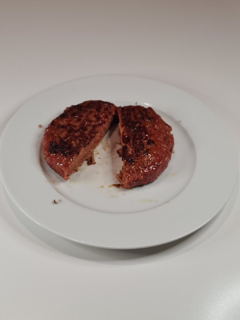 Die 115g schweren Patties basieren auf Erbsenproteinen – wobei der Anteil mit unter 20% relativ gering ist. Die rote Farbe erinnert an rohes Hackfleisch, was den Burger vor dem Braten optisch nahe an Fleisch bringt. Die Farbe wird aber beim Anbraten mehrheitlich beibehalten, womit er im Burger selbst etwas zu rot wirkt. Der Geschmack ist fleisch-ähnlich, doch der Burger bringt für uns auch einen leichten Eigengeschmack mit. In reichlich belegten Burgern oder mit einer intensiveren Sauce kann man dies zwar gut überdecken, in einem einfacheren Burger schmecken wir dies aber.